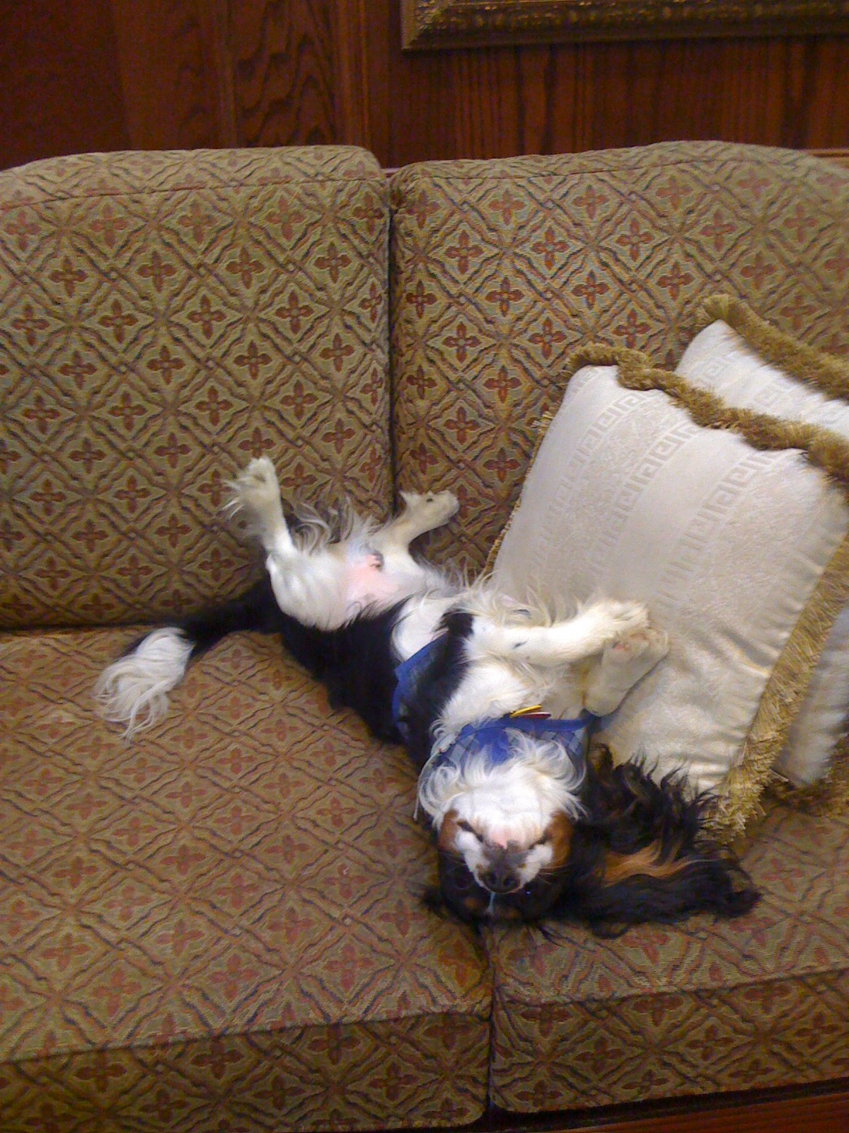 The baby’s love to relax and be lazy bones. They jump up on the couch in daddy’s office and just make themselves at home!