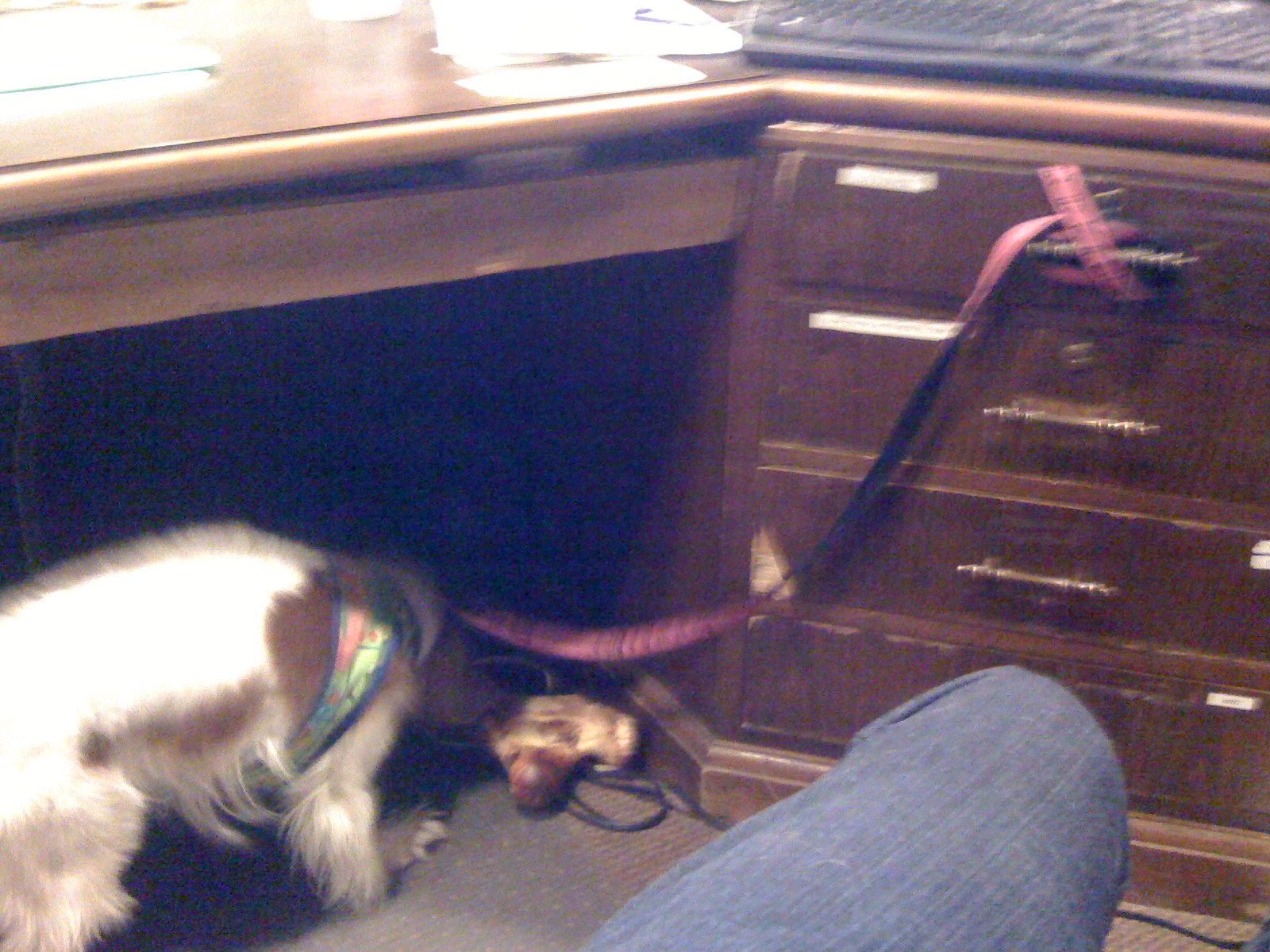 Daddy says this is a new tool he should patent. He ties us up when he brings new bones, cause Dixie is such a bitch and Willie teases her too. He has hooks throughout his office, so he can just tie us up anywhere, on opposite sides of the office, by a door, or whatever. Somebody needs to report him, he is so mean!