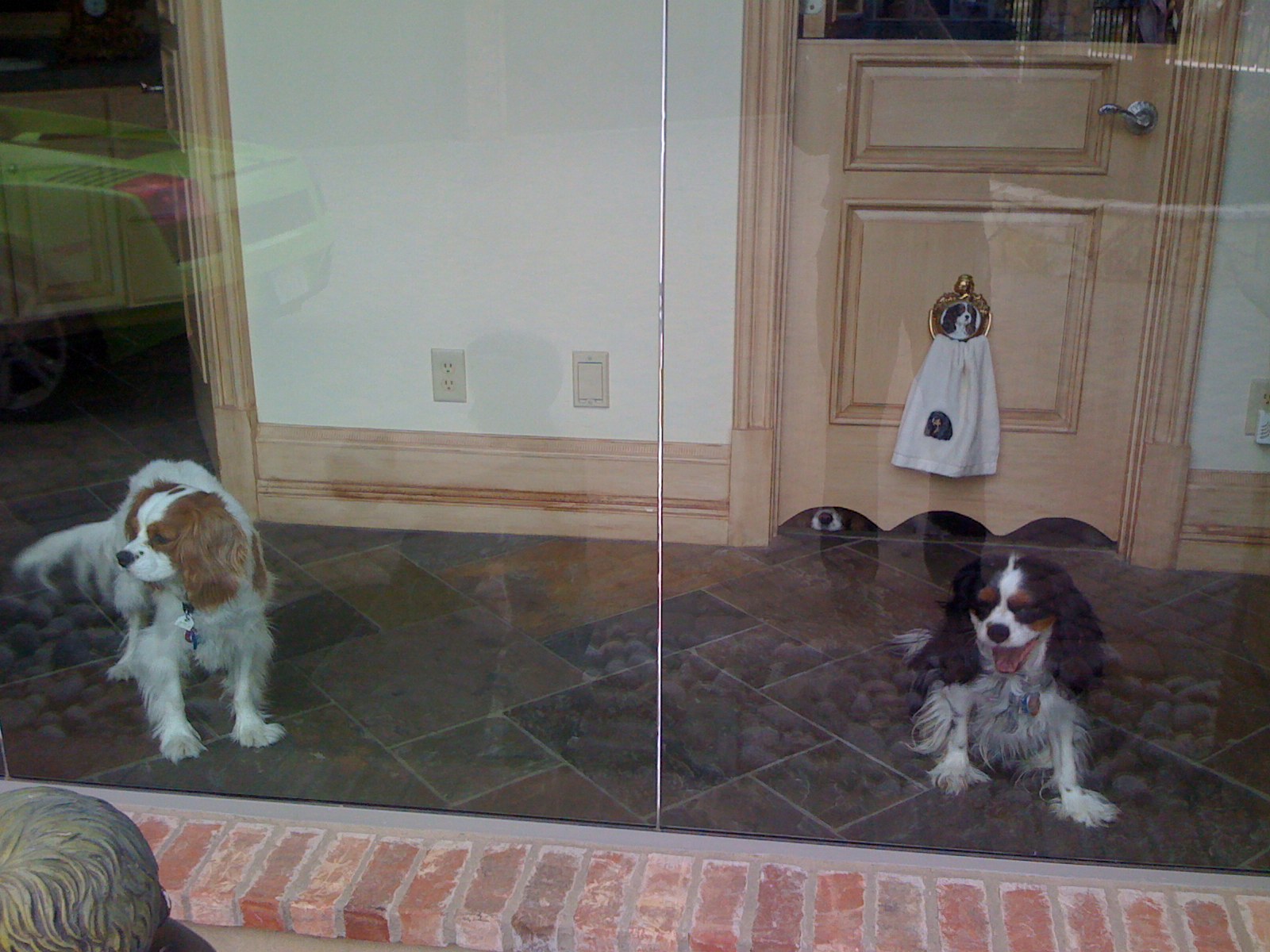 OK, guys. Fess up. Who are you holding hostage behind the door? All I can see in the photo is a little muzzle poking out from under the door with the lovely Cavalier towel holder!!!