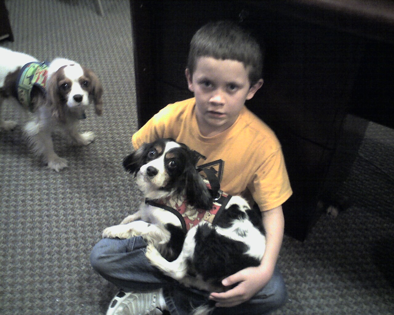 My friend Fish Knittel (his real name is Cole Knittel) is a silly boy. He comes to work with his momma Jennifer Knittel some-days. He is so goofy. He came in to daddy’s office to play with us, but then fell asleep listing to daddy’s music. Willie says he sleeps kinda funny. Here he is holding one of our rescue fosterCavalier brothers too.