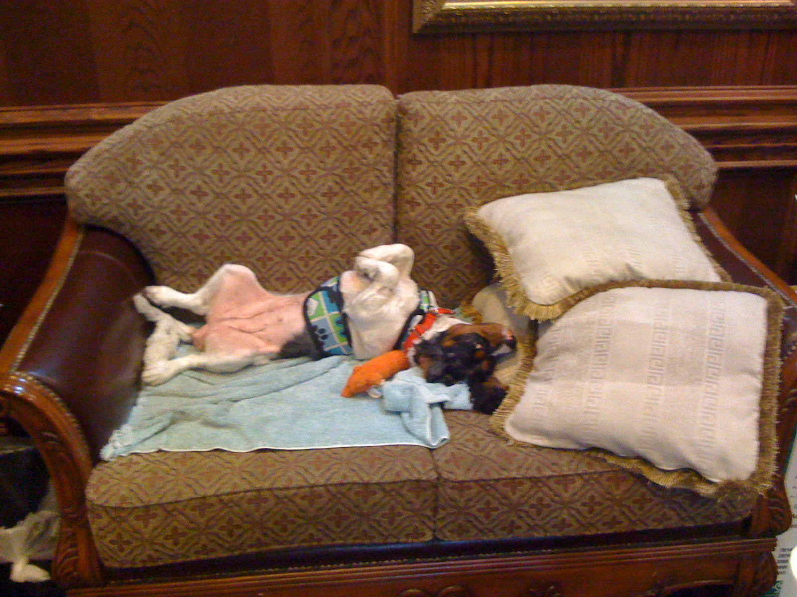 Ali, our new rescue foster sister, is laying on daddy’s couch at work, I think shes gotten pretty comfortable with this gig!