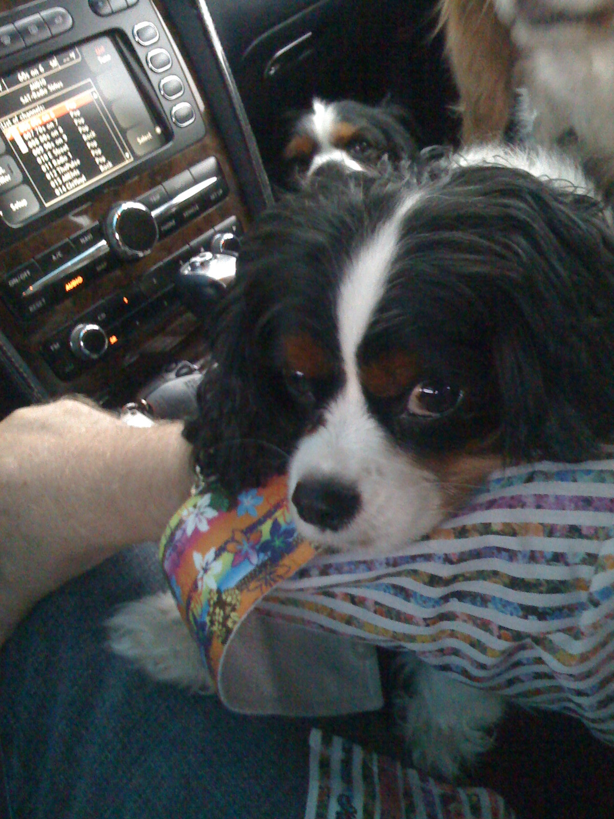 Jhansi likes to lay her head on my arm like that in the car. She is an awesome rider, and falls asleep as soon as she gets in the car. Cadie likes to look out the windows, and be bossy.