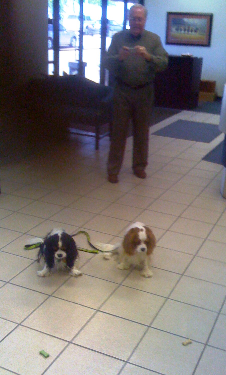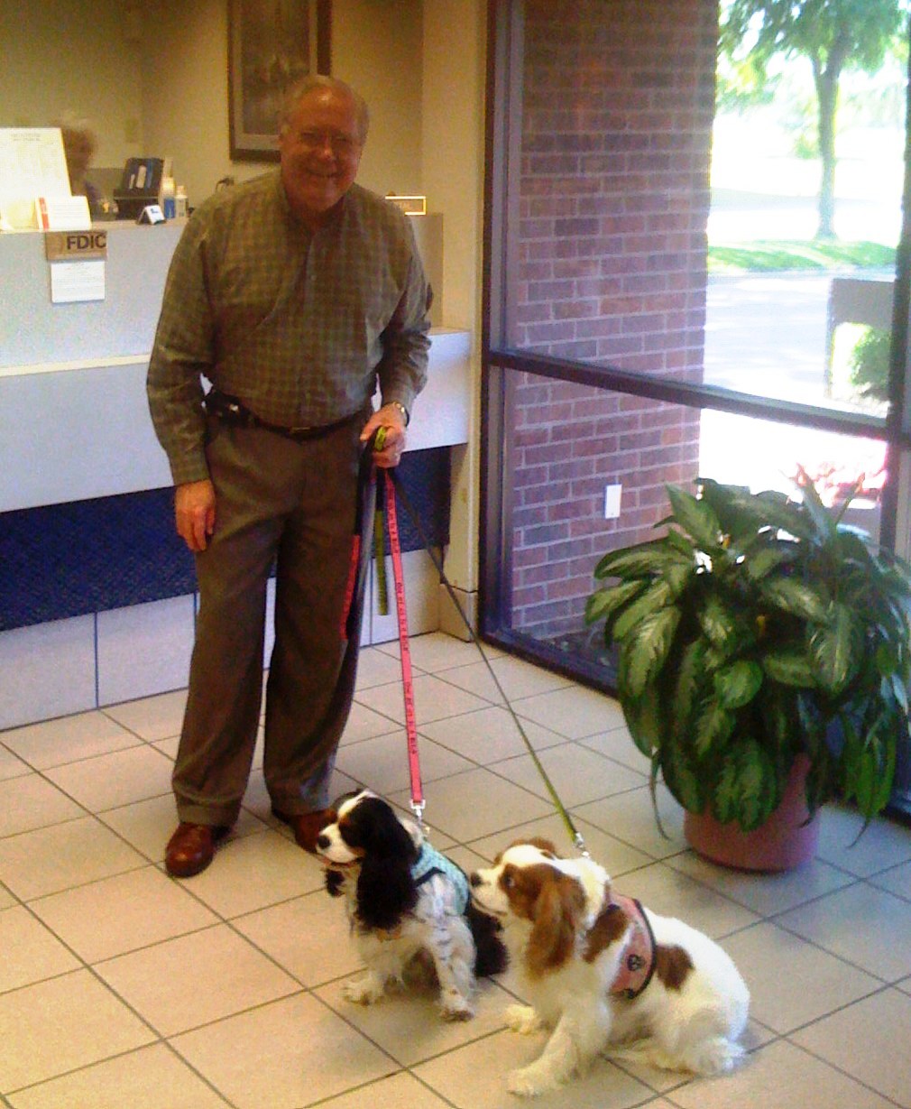 The babies love to go anywhere, but they especially like the banks, cause they usually have treats. Daddy says some of the banks are too cheap to have treats, but Willie says with the new stimulus package, they will be able to afford treats. Dixie says he is just being a smart alec. They met the head bean counter at Riverbend bank, Tommy Walling. Daddy has known Mr Walling for a real long time, like 20 years. thats people years, not dog years. .