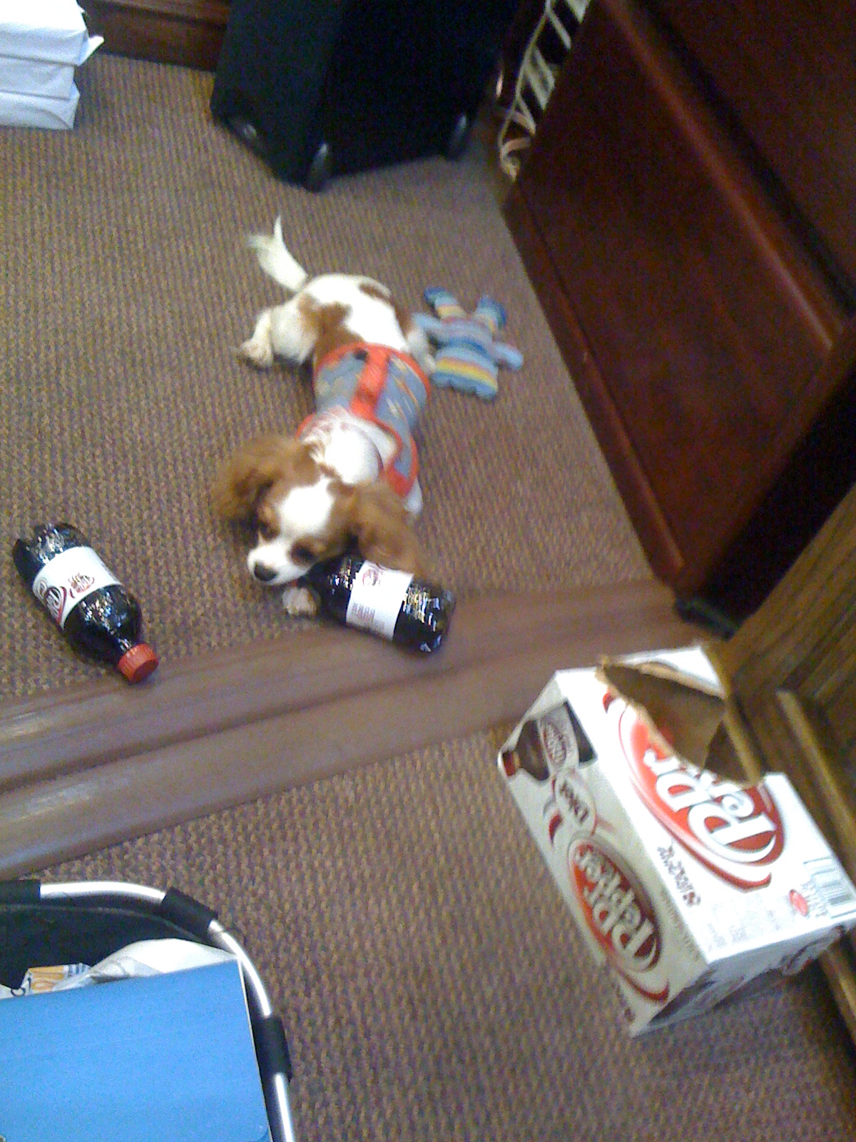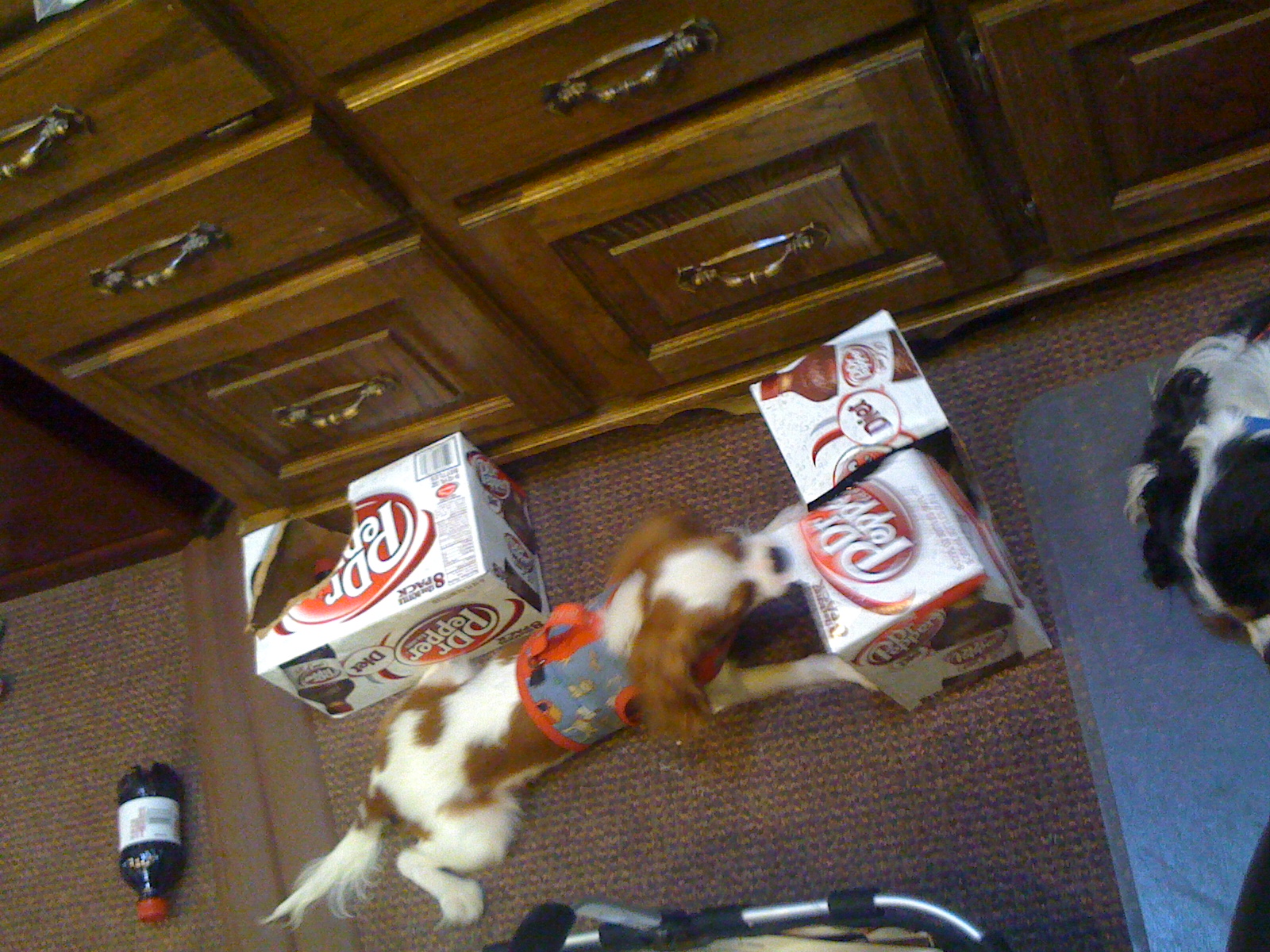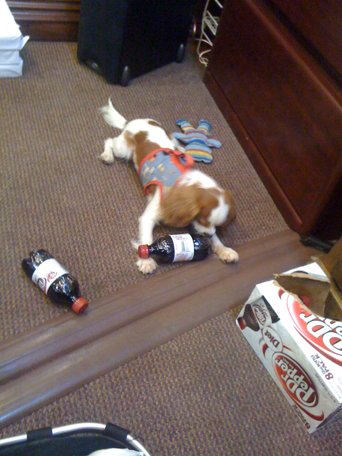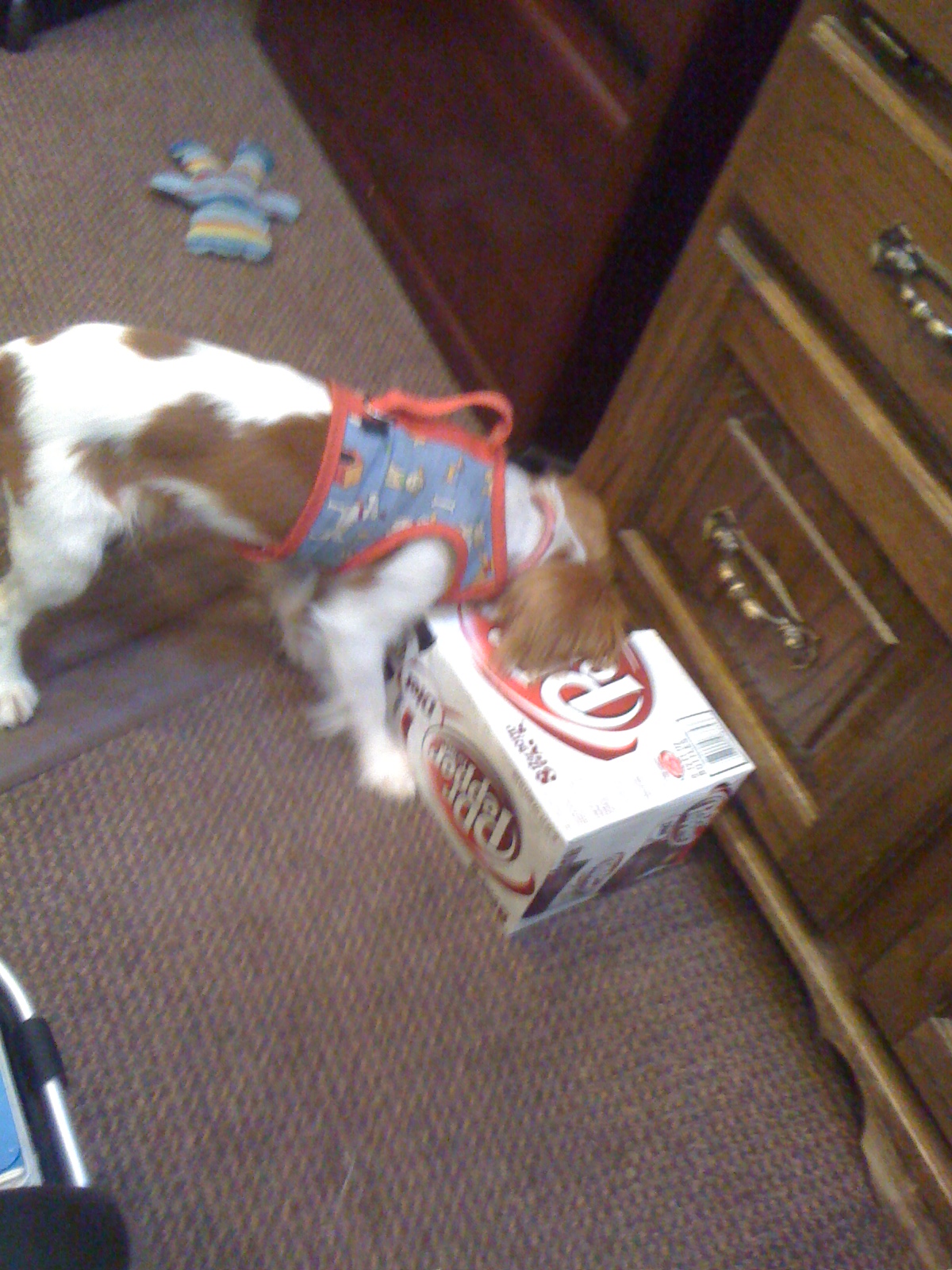 Lance is our newest foster brother. He loves Dr Pepper. Well, actually he likes the bottles, full or empty. He drags them all around daddy’s office. it irritates daddy, but we think its funny. Lance is nearly full grown, but only weights 8 lbs, about half of a normal Cavalier King Charles Spaniel weight. He even opens the boxes when daddy isn’t looking and takes them out. Lance says he likes Diet Dr Pepper best, but who is he kidding, no one likes diet drinks. Willie likes beer, but daddy wont get him any.