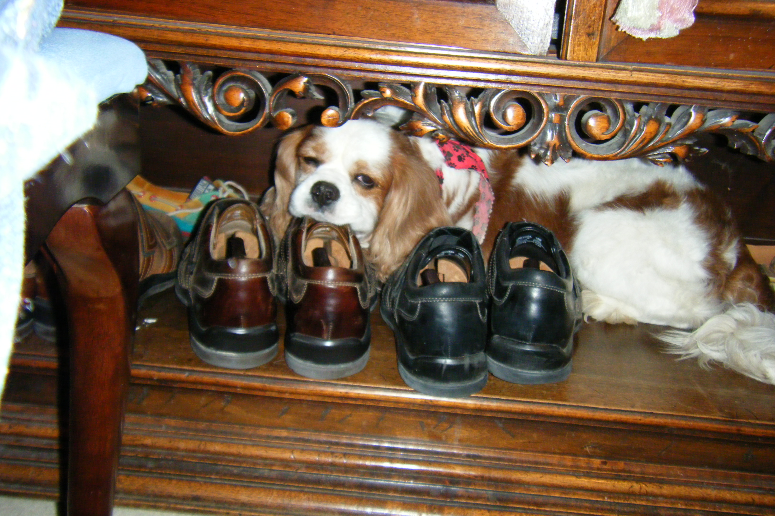 Rogan has a shoe fetish Dixie says. Dixie says most ladies are shoe whores, but since dogs don’t wear shoes, she cant be, but she is a bone whore Willie says. Anyway, Rogan likes to get in daddy’s shoe cabinet in a blank spot each morning when daddy puts on his shoes, and lay there till we leave. Daddy says it doesn’t stink there, but our noses are sensitive, and we think it stinks pretty bad.