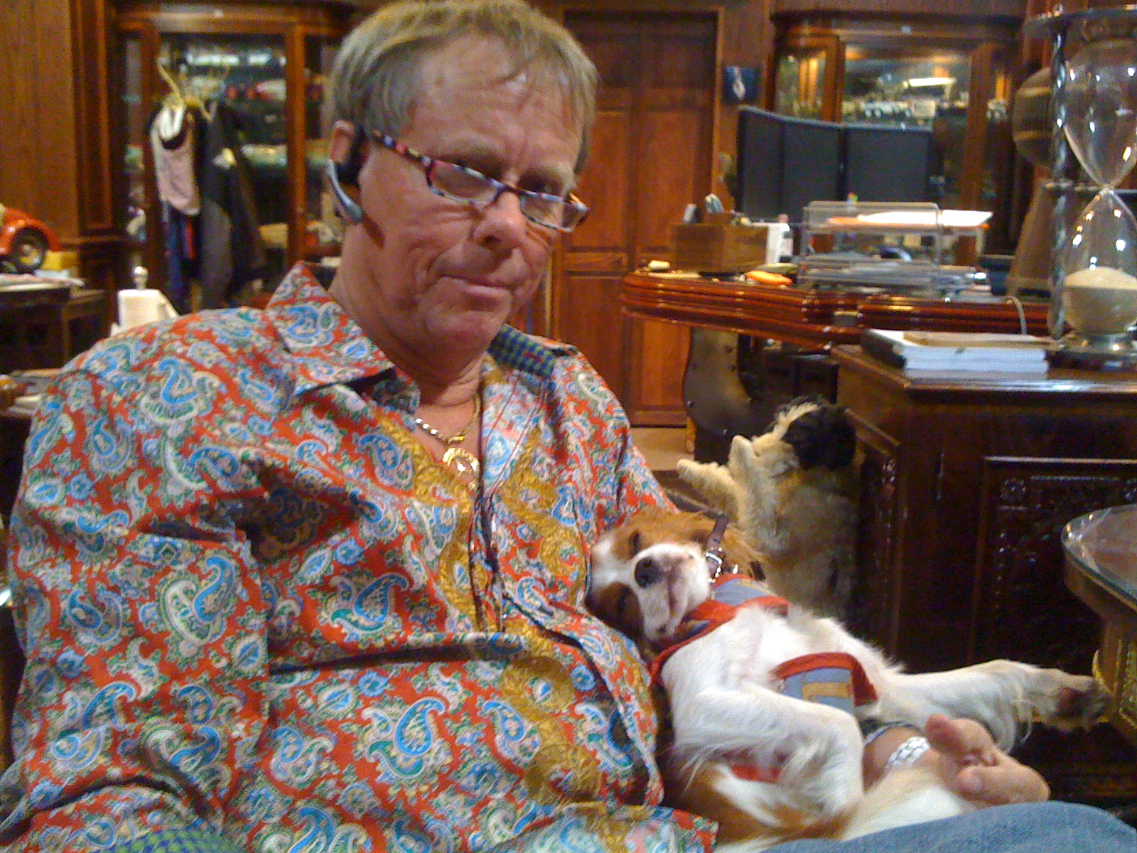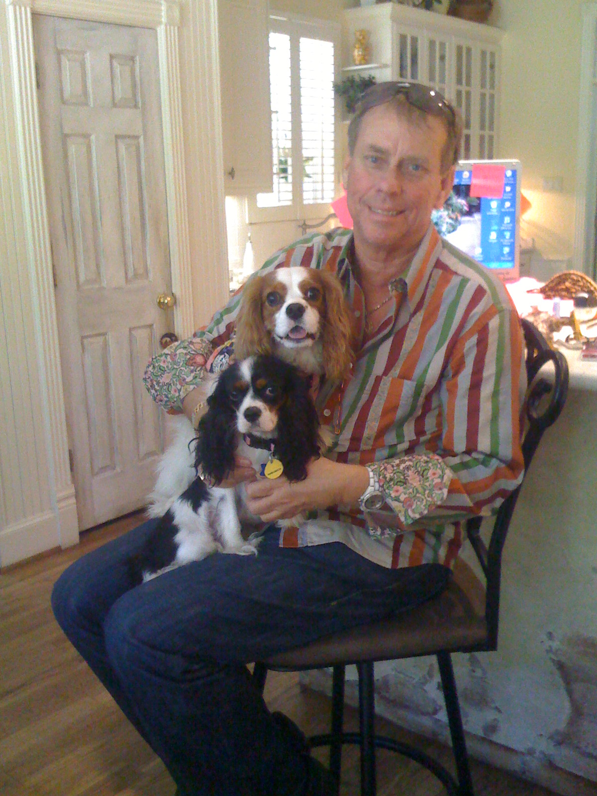 We love our daddy. We love it when he holds us, and just spending time with him. We are all rescues, and we get lots of foster brothers and sisters, so we hope you will visit the Cavalier Kind Charles Spaniel web site and see about adopting a Cavalier, we make wonderful pets. Except Willie, daddy says he is a pain in his ass. He said the tother day he was gonna trade Willie for a weenie dog, but we think he was just mad cause Willie chewed up his tag Hauer sunglasses.