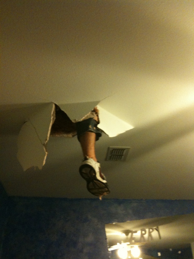 It was Dixie’s idea. She said it was April Fools day, so we should gig all of you that are on Facebook or reading our blog. Who are we kidding? Did ANY of you REALLY think daddy would do ANYTHING like work in the attic? Daddy NEVER does repair work etc, he’s not good at honey do lists or anyone’s lists. These pictures came from a friend, so it really did happen, and it wasn’t April Fools.