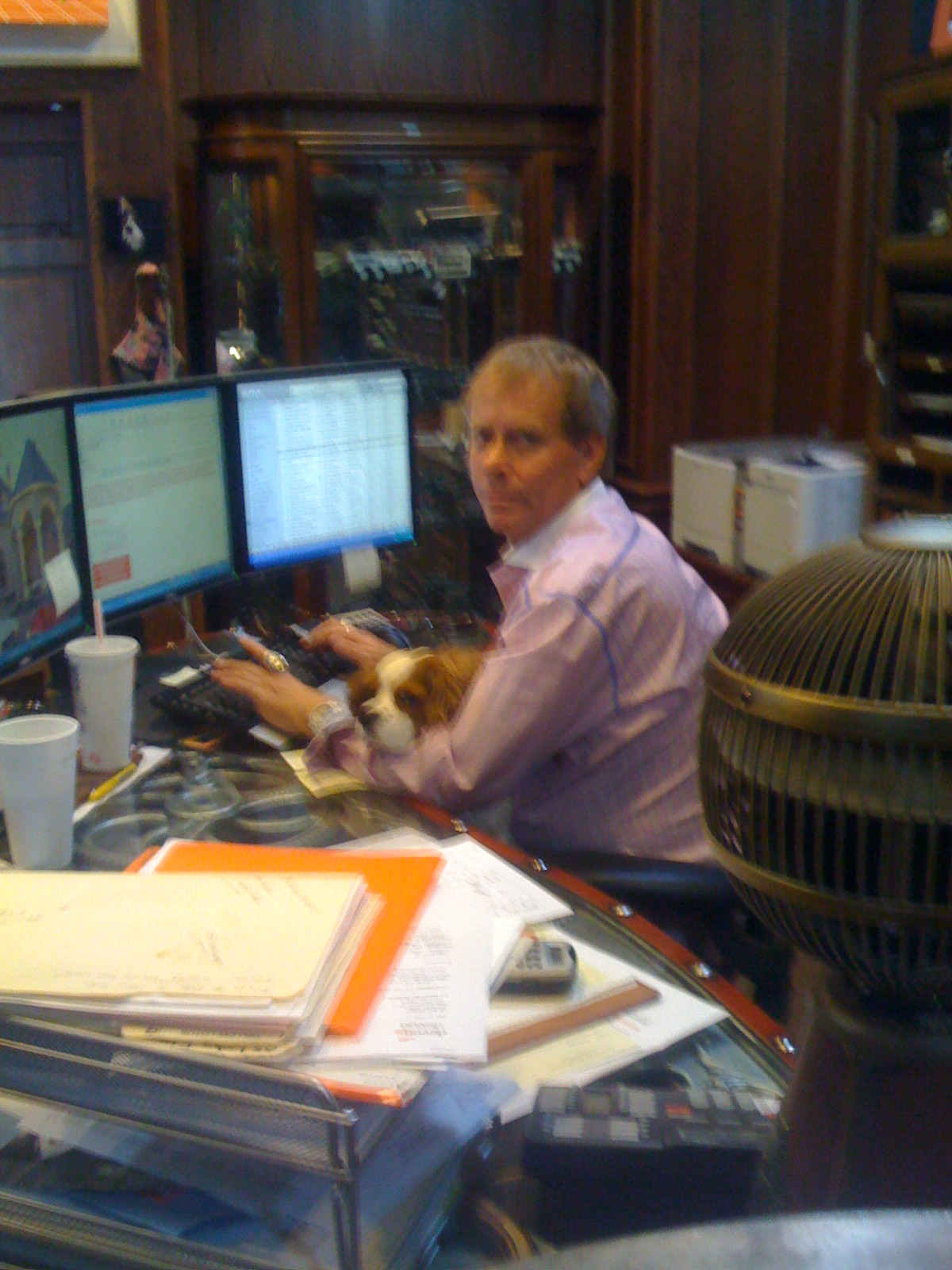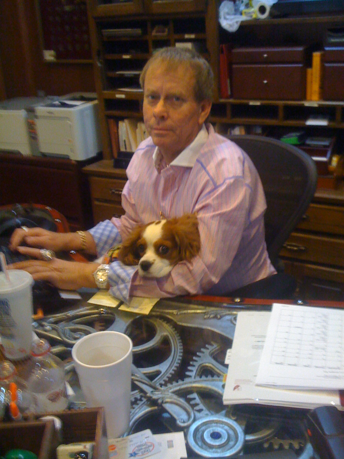 Lance is learning to help daddy with some things at work, and learning to use the computer. This is a good thing, since Willie is the only one of us that can use the computer, and he is very restrictive about what he will do for us. We get mad ’cause he wont look up things for us on the internet, like new bones, unless we give him some of our toys or bones. Daddy says Willie is the godfather, the "head man" but we think he’s just gangsta.You can see daddy’s desk here, its kinda messy we think. It has a glass top, and gears inside it that turn, its pretty cool. Sometimes daddy plays a dog video on one of the three monitors, and we get real excited when we hear the barking.