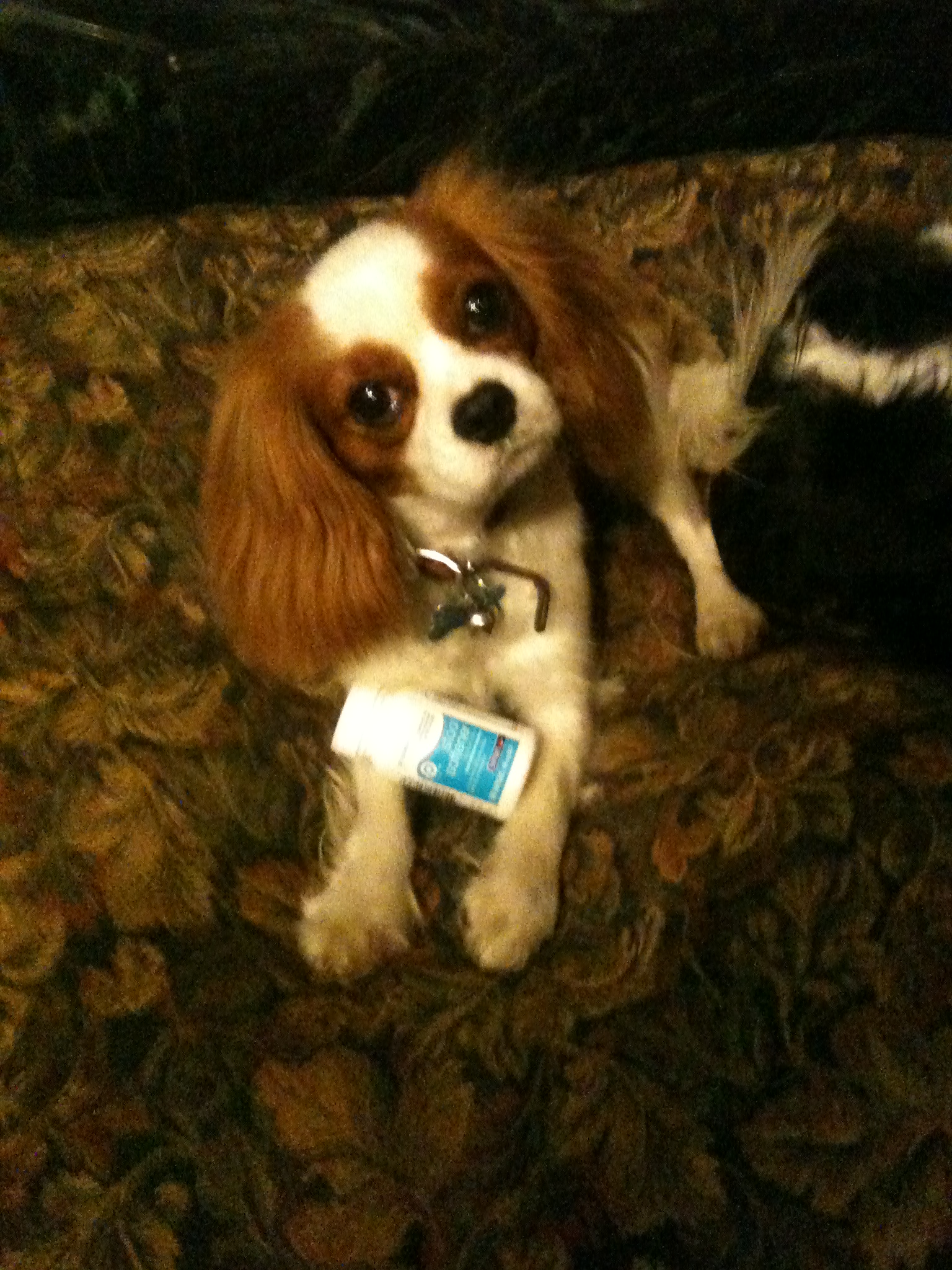 Lance LOVES pill bottles. Daddy saves all of them for him, he loves to chase them and roll them around on the floor. Daddy says its ok, ’cause its cheaper than bones.