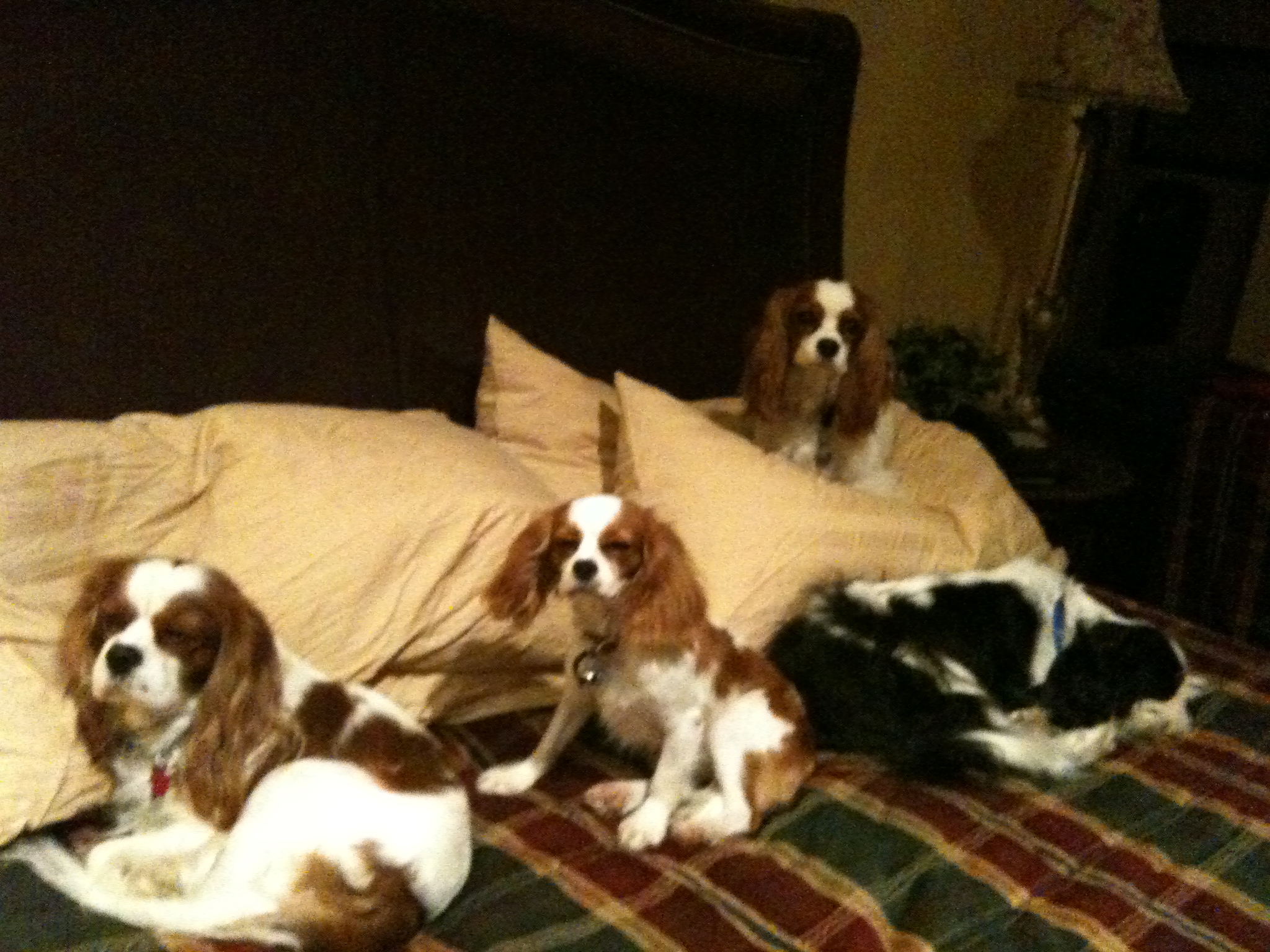 We jump right up on the bed, we hope daddy wont notice. We only sleep on the big bed, snuggled up with daddy, if their is lightning or thunder. Otherwise, we sleep in our big crate, we like it there, and sometimes go to bed there before daddy comes to bed. We also have 2 extra crates for when we have new foster brothers and sisters.