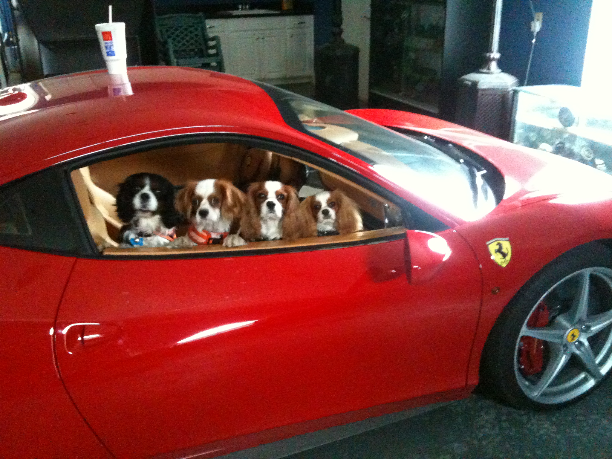 The babies are liking riding in daddy’s new hot rod, a Ferrari 458. Willie says it hurts his ears, but Lance likes it. Dixie says it rides too rough. You can watch the video here, or if it doesn’t appear below, watch it on you tube. Porsche and Puddles are both available for a new forever home.