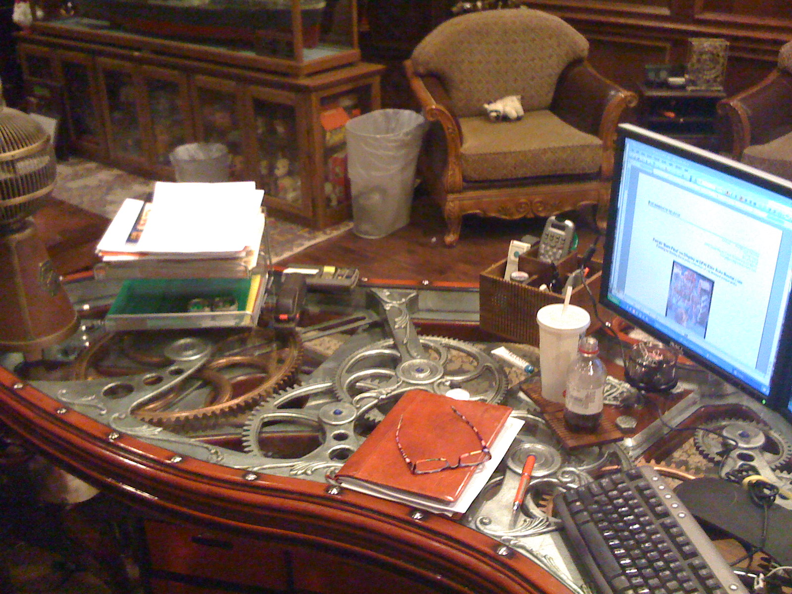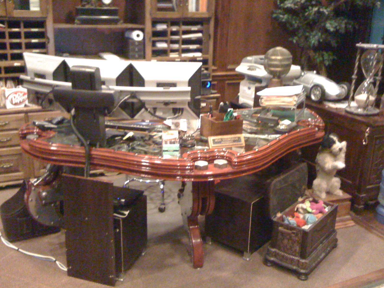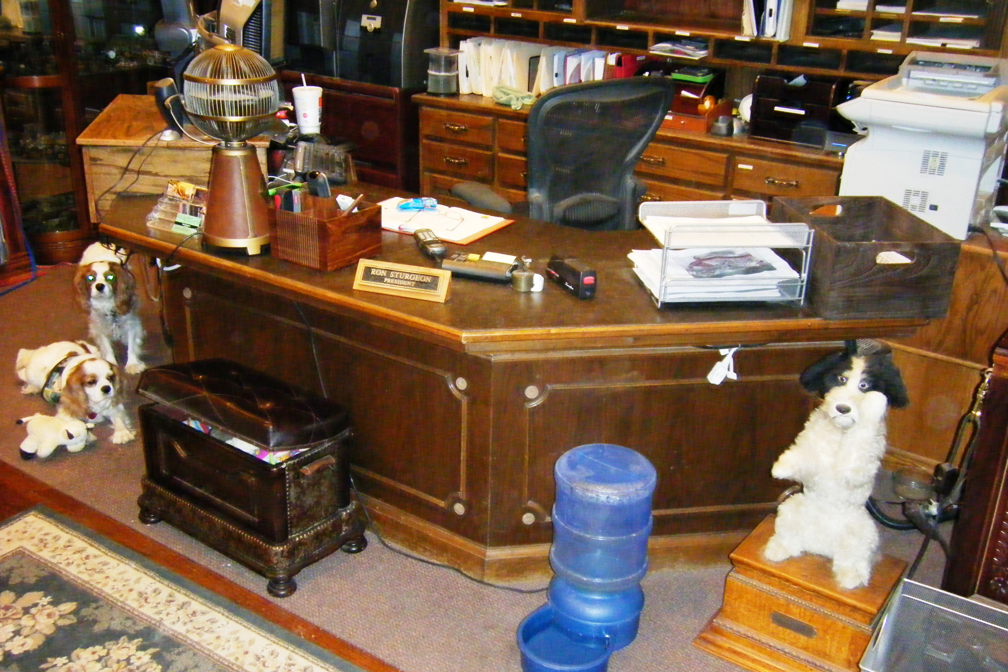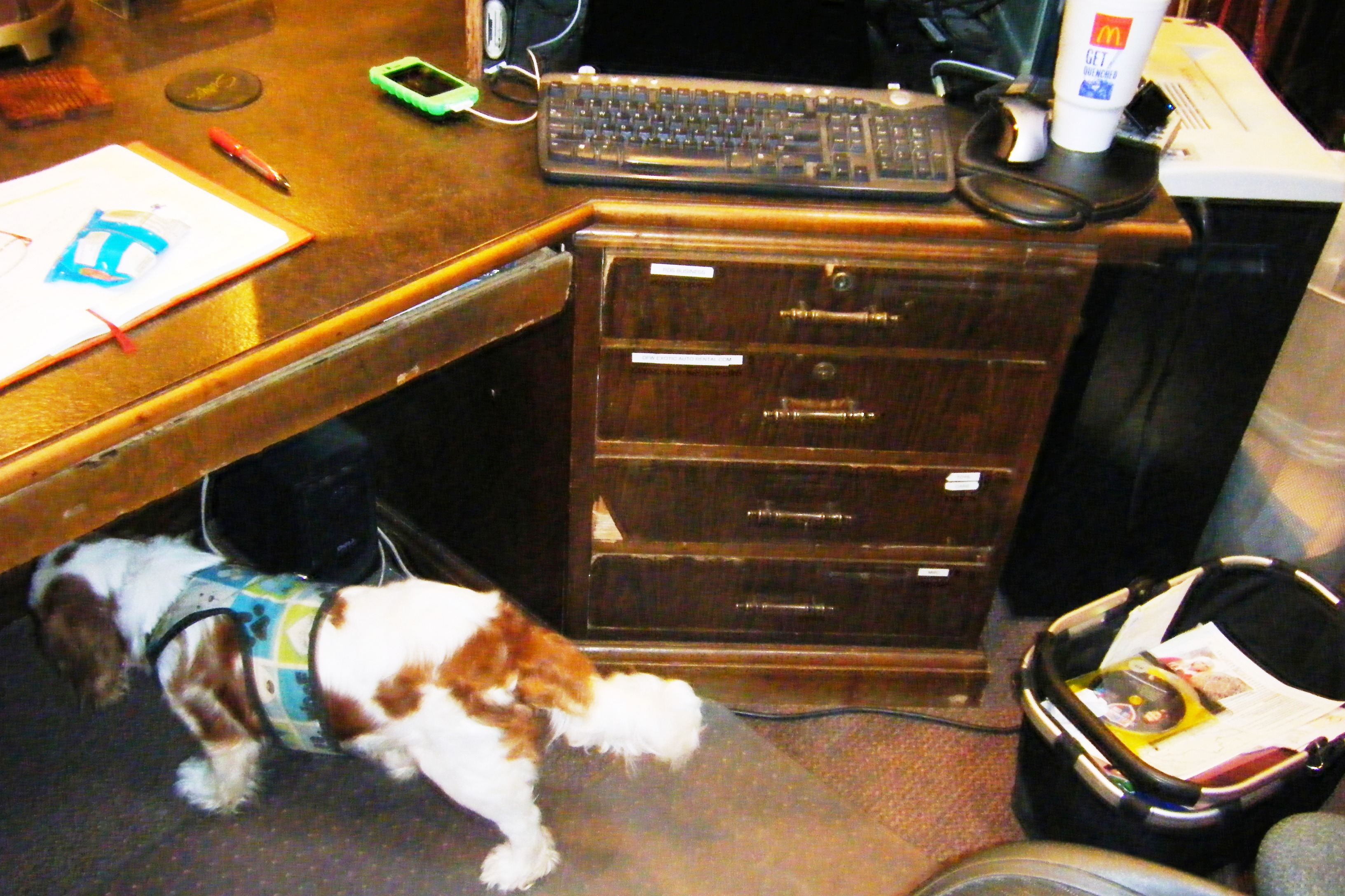 You can see daddy’s turn of the century store window display of a moving dog, when he plugs it in and turns it on its scary. That’s Dixie to the left of the old desk. And you can see our toy box in front of the old desk. and on the lh side of the new desk. Daddy made us clean up all the toys, which we drag out daily, for this picture. That sucks.